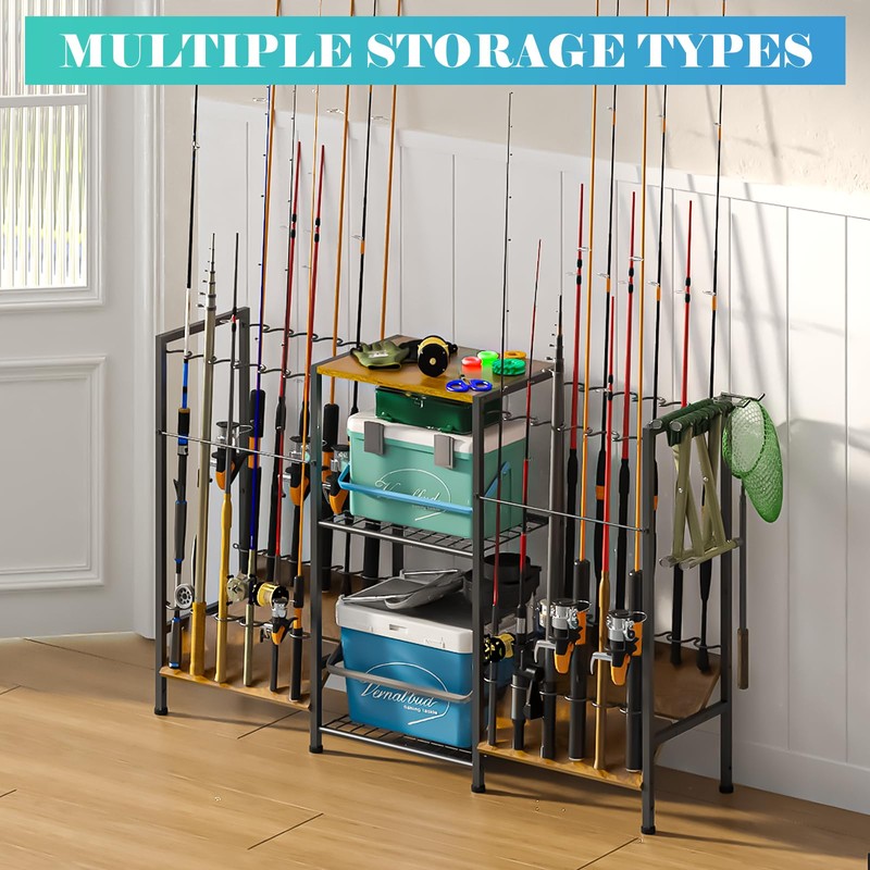 - ✅ Heavy Duty Construction with Adjustable Feet for Stability: Each storage shelf supports up to 60 lbs, making this a reliable heavy duty fishing rod rack. Equipped with 6 adjustable feet, this freestanding rack offers excellent stability on uneven floors—ideal for garage fishing rod stand or outdoor areas.