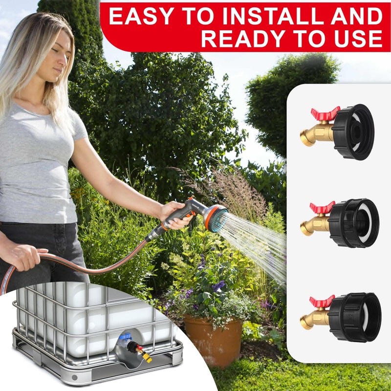 High-quality materials: IBC Brass Garden Hose Adapters and Shutoff Valves are made of polyethylene and lead-free brass and are strong, durable, and leak-proof. Efficient high-flow Core Valve: We've enhanced the core valve with a built-in high-flow core valve for faster and more consistent drainage. This efficient design alleviates the traditional problem of low flow rate, ensuring you can use it easily and quickly. Double Protection: Our IBC tote adapters have a built-in silicone gasket and thread-sealing tape for double leak protection. Versatile: The adapter is compatible with most standard IBC containers for garden irrigation and household and industrial applications. Its rugged construction handles various liquids such as agricultural water, inks, paints, and coatings. The kit includes three different sizes of adapters: 2.44-inch fine thread, 2-inch fine thread, and 2-inch coarse thread + a 1/2-inch x 3/4-inch brass shutoff valve, quick disconnect, and a roll of thread sealing tape. It fits most standard American IBC containers, pails, and other plastic drums.