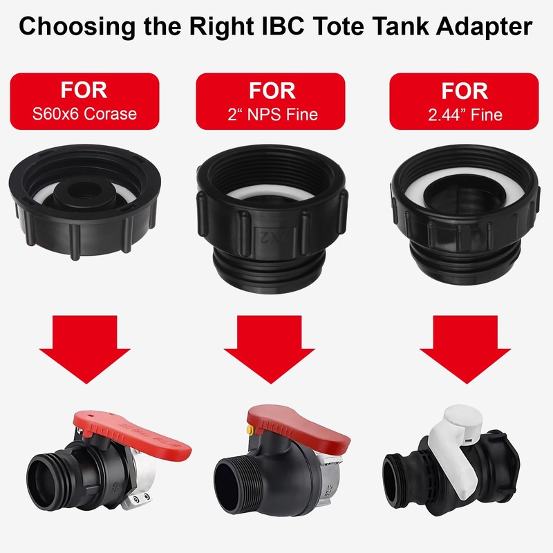 • The kit includes three different sizes of adapters: 2.44-inch fine thread, 2-inch fine thread, and 2-inch coarse thread + a 1/2-inch x 3/4-inch brass shutoff valve, quick disconnect, and a roll of thread sealing tape. It fits most standard American IBC containers, pails, and other plastic drums.