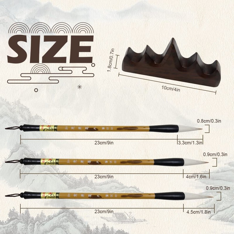 3 Sizes Chinese Writing Brush with Wood Rack Pen Rest, Calligraphy Brush Set, Sumi Painting Drawing Brushes, Kanji Art Brushes for Professional Beginners (Large, Medium, Small Size)