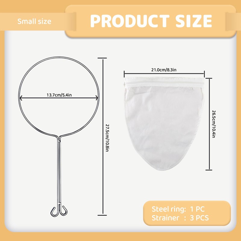 - Einzigartiges Design: Die Verpackung enthält 3 kleine Filterbeutel und 1 festen Edelstahlring. Filterbeutelgröße:10.43*8.26'' (26.5*21cm) Kreisringdurchmesser: 5,39 Zoll (13,7 cm), Grifflänge 10,82 Zoll (27,5 cm), mit Hilfe dieses Siebbeutels müssen Sie nicht erneut filtern