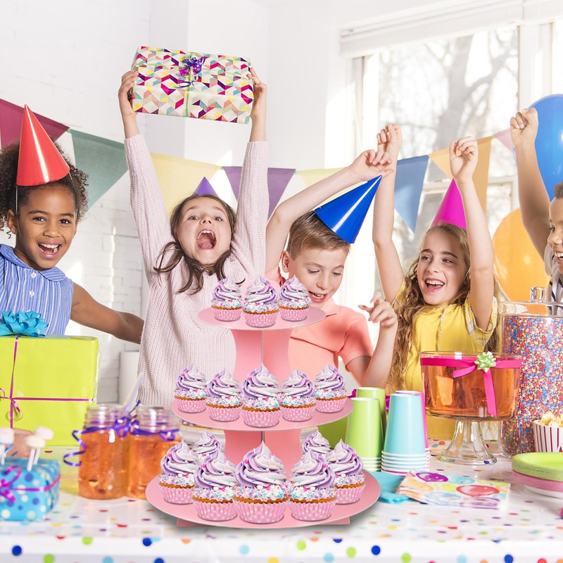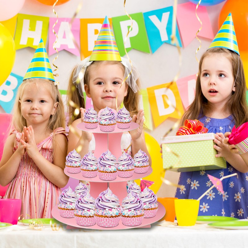 3-Tier Cardboard Cupcake Stand,Pink Cupcake Stand Tower for Birthday Wedding DIY Dessert Decoration