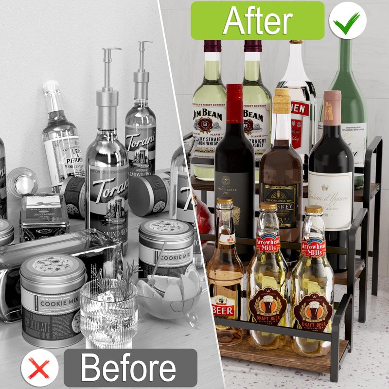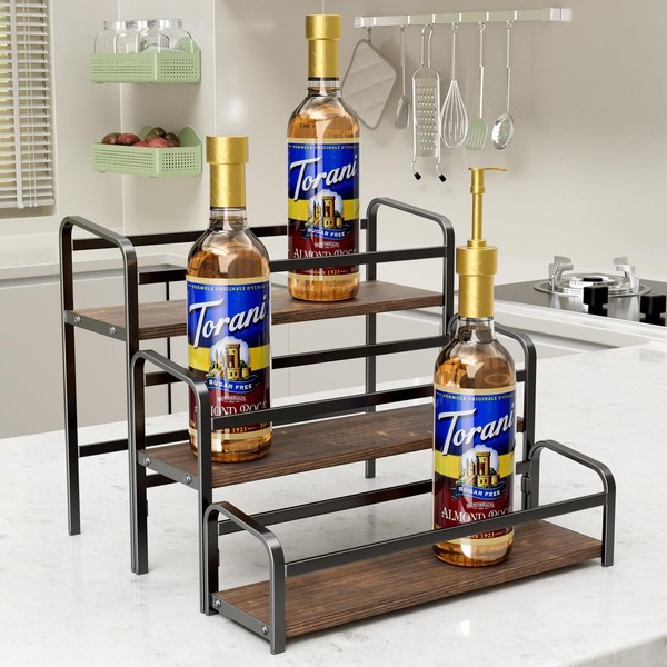 - đ„ăStable Structure & High Quality ăThis countertop syrup organizer is composed by solid wood shelf and metal frame ,you will be surprised by its sturdy structure and high quality materials. Its modern farmhouse look will complement any home decoration, perfect addition to coffee bar, coffee station, kitchen, bar or cafe counter.