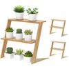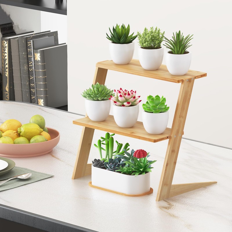 - 【Z-shaped Structural Design】Breaking through the rigid form of traditional straight-line small plant stand, this Z-shaped table top plant stand features an 11-inch deepened base + 1.8-inch widened borders, increasing contact area by 40%. With 30 lbs per layer load capacity, its stability rivals metal racks while retaining the lightweight elegance of bamboo