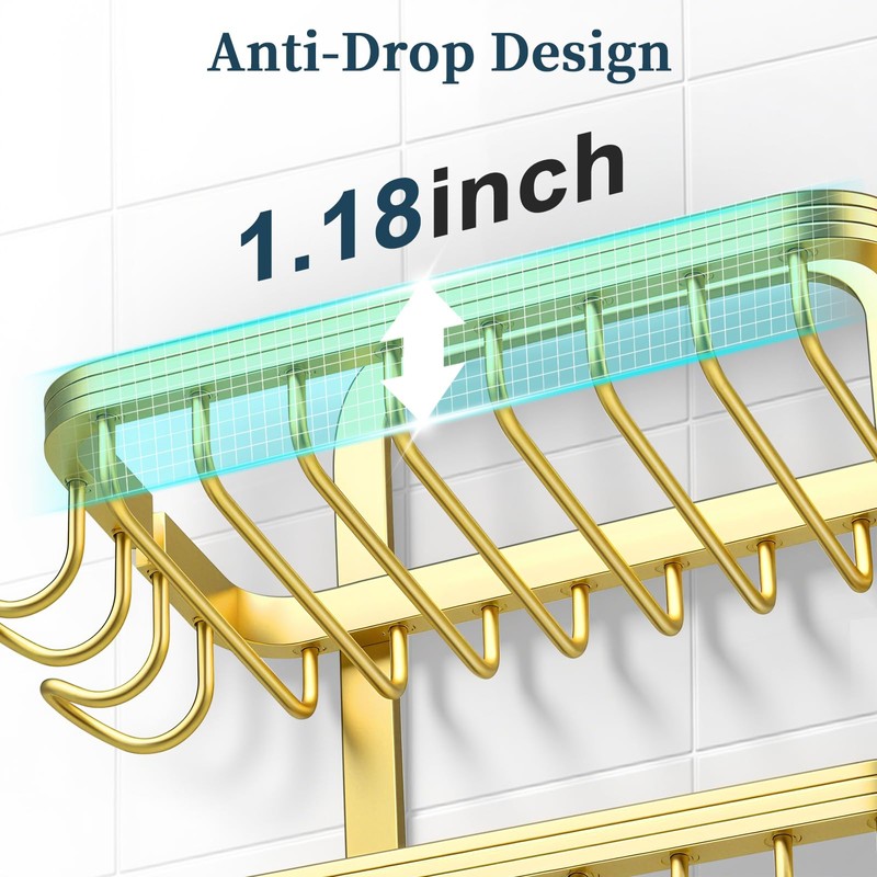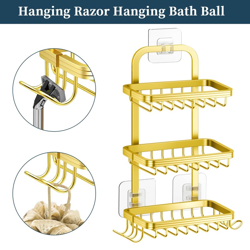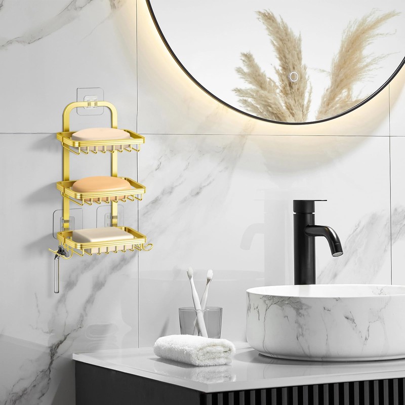 3 Tier Soap Bar Holder for Shower, Aluminum Wall Mounted Rustproof Soap Holder with 4 Hooks and Razor Holder, Shower Rack Soap Tray Bar Soap for Bathroom Accessories Organizer Gold