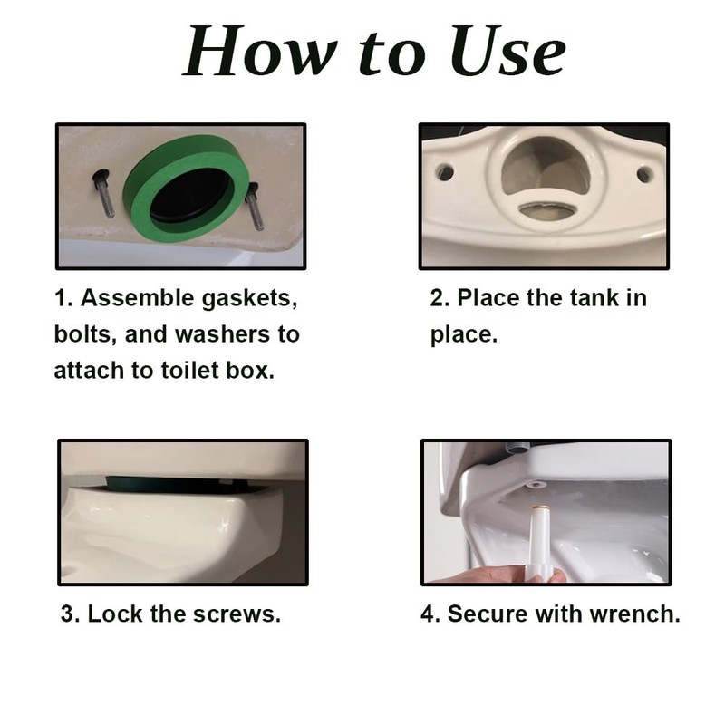 EASY TO INSTALL The toilet tank to bowl seal kit comes complete with screw fixings for easy installation and removal. The replacement can be carried out without special skills or complicated tools, which greatly simplifies maintenance work. Meanwhile, its easy to clean feature also helps to keep the toilet hygienic and tidy.