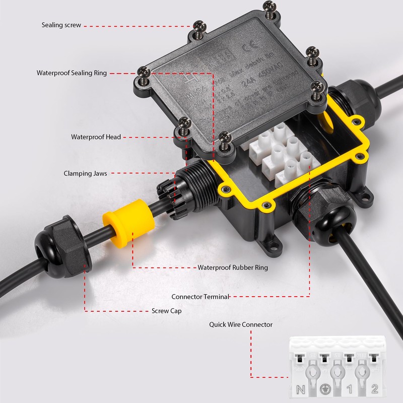 - ✅【MATERIAL】: Junction box is made of high quality nylon, which means it will not break or fade in sunlight and will last you for years. Cable connection box in black for indoor and outdoor use suitable for distributing and connecting cables with a diameter of 4-14 mm.