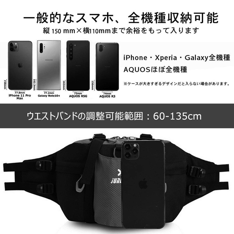 - Adjustable Strap: The size of the bag is 19.7 x 11.8 x 7.5 inches (50 x 30 x The suitable waist length is 23.6 - 53.1 inches (60 - 135 cm), and you can freely adjust it according to the circumstances, so it is suitable for large body types. (This bag does not include a water bottle.)