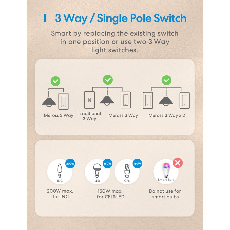 - Affordable and Easy to Install: With Meross’s patent designed 3 Way smart wireless light switch, you only need to replace one traditional 3 Way switch. Half cost and labor. 15 mins installation. Meross smart light switch fits for your existing 1/2/3/4 gang standard size Decora/GFCI faceplate. Works with the 2.4G WiFi only, do NOT support 5G WiFi, no hub required.
