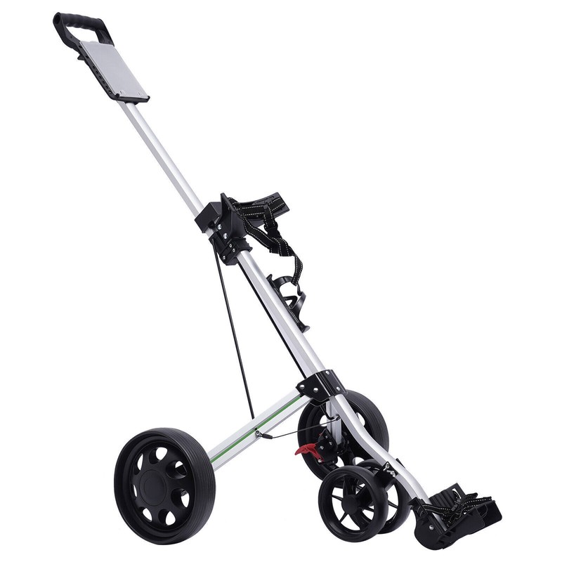 Foldable and Lightweight: You just place your foot on the front wheel and pull up on the top of the cart until it clicks into place to fold it, which is compact to easily fit in the trunk of your car. The 6.6 lbs lightweight allows for easy pushing&pulling around the course.