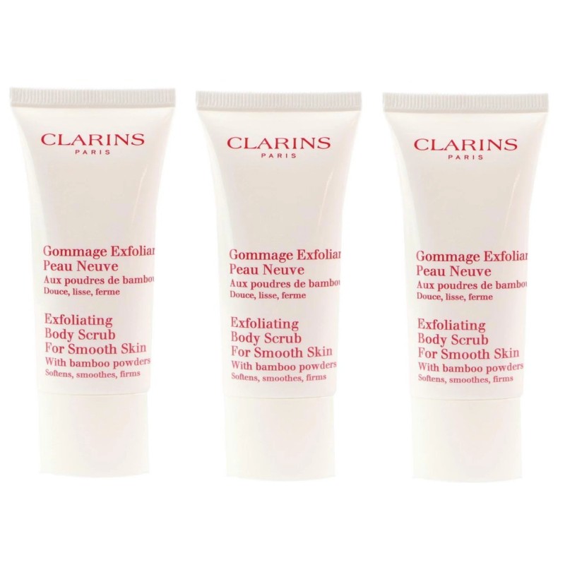 - - The Clarins Paris Women's 3 Bottles of Exfoliating Body Scrub with Bamboo Poder is designed to softly softens, smoothes, and firm the skin, providing a luxurious and comforting experience during your daily routines.
