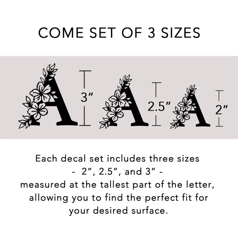 - Premium Quality Vinyl Decals for Ultimate Personalization: Our floral initial vinyl decals are crafted from high-quality outdoor, self-adhesive vinyl, ensuring durability and long-lasting adhesion. Each decal set includes three sizes - 2”, 2.5”, and 3” - measured at the tallest part of the letter, allowing you to find the perfect fit for your desired surface.