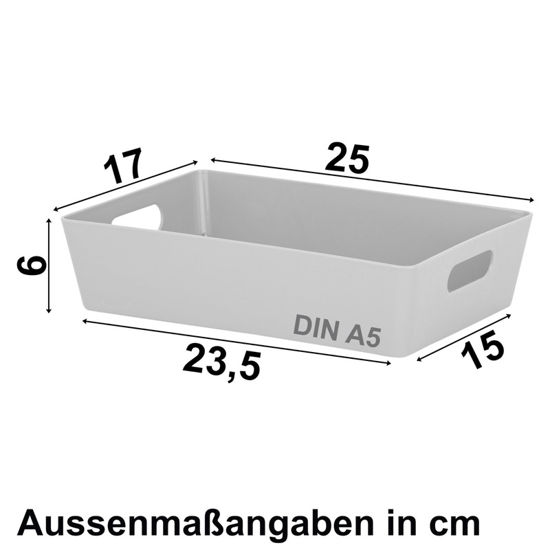 • 3 x organiser boxes: 3 pieces - 6 cm high. Outer dimensions: approx. 25 x 17 x 6 cm. Inner dimensions of base: approx. 23 x 14.5 cm, DIN A5 format. Capacity: approx. 2 litres. Colour: grey