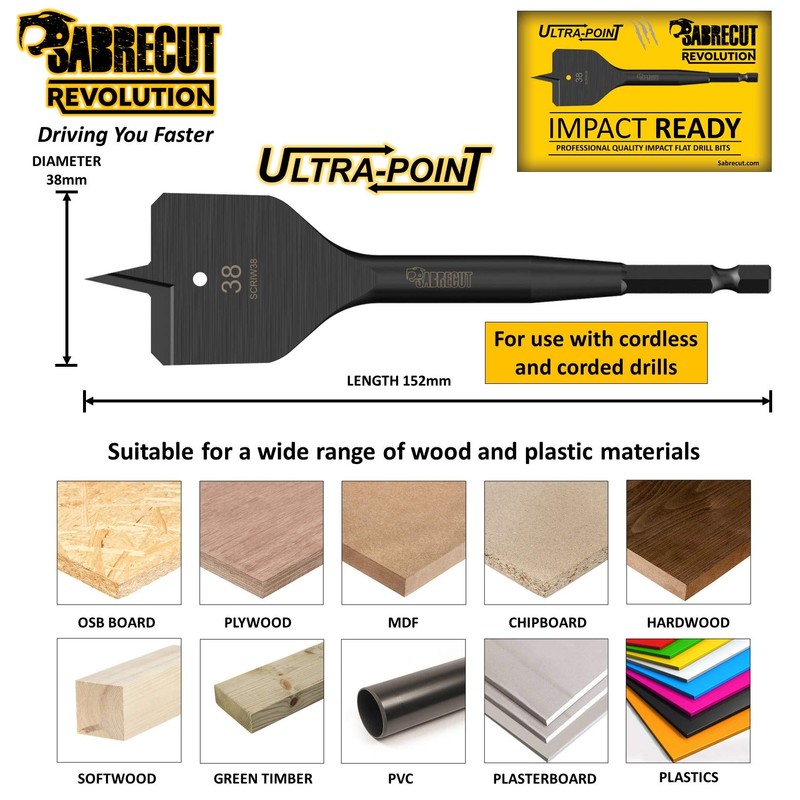 SabreCut Revolution Impact rated spade bits features a extra thick toughened shank designed for use in impact drivers, combi drills and drill drivers. Professional quality impact spade bits with a universal 1/4" hex. Can also be used in standard chucks for a secure non slip fit.