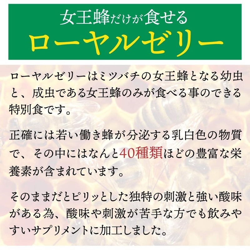 • 三大栄養素である「炭水化物・脂質・たんぱく質」を始め、アミノ酸、ビタミン、ミネラル等約40種類以上の栄養をバランスよく含んだローヤルゼリー。とれたてローヤルゼリーを冷凍保存してフリーズドライ製法で粉末化し、デセン酸含有率6.0%を実現しました。