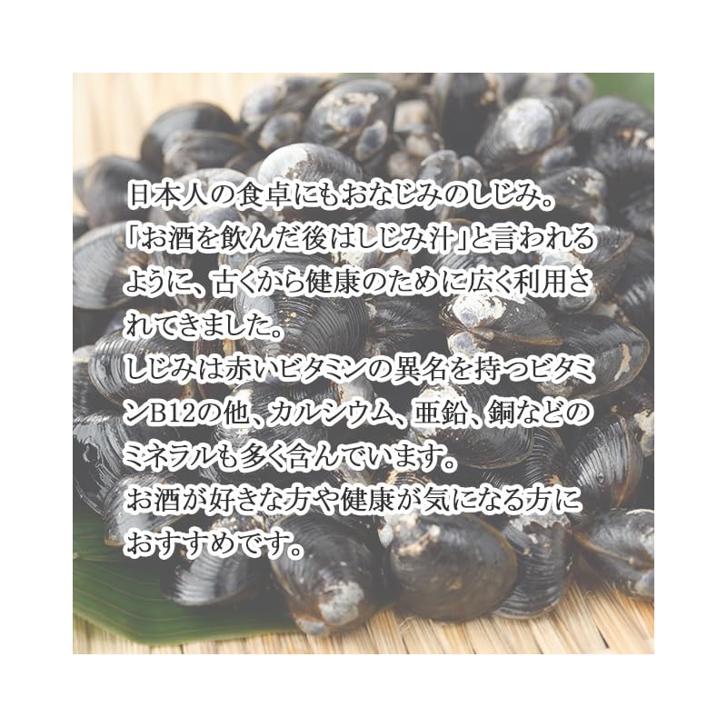 - 「お酒の後にはシジミ汁」と言われるように、しじみは古くから健康のために広く利用されてきました。赤いビタミンと呼ばれるビタミンB12を多く含み、カルシウムや亜鉛などのミネラル分も豊富に含まれます。