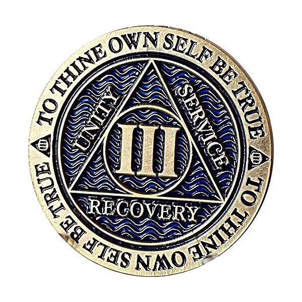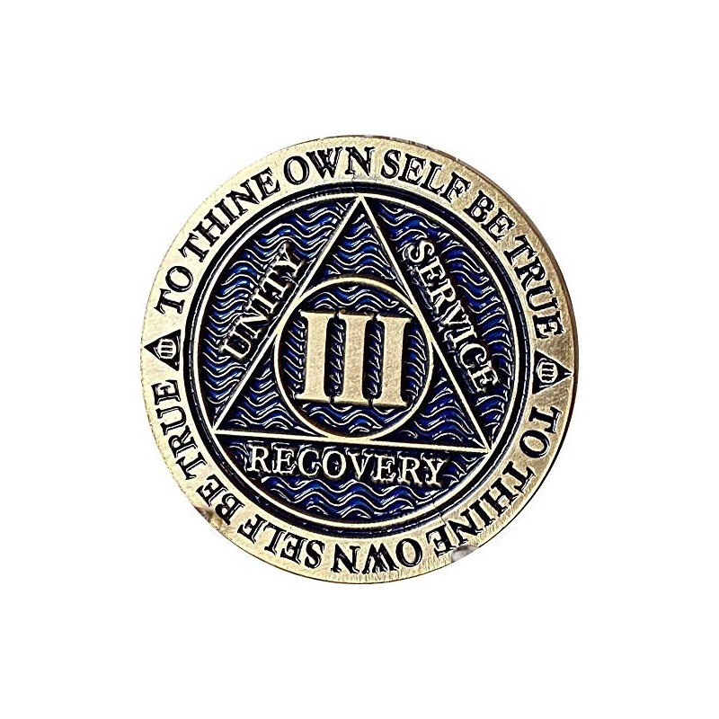 - 3 Year AA Medallion In Reflex Design Antique Bronze and Blue With Serenity Prayer On The Back