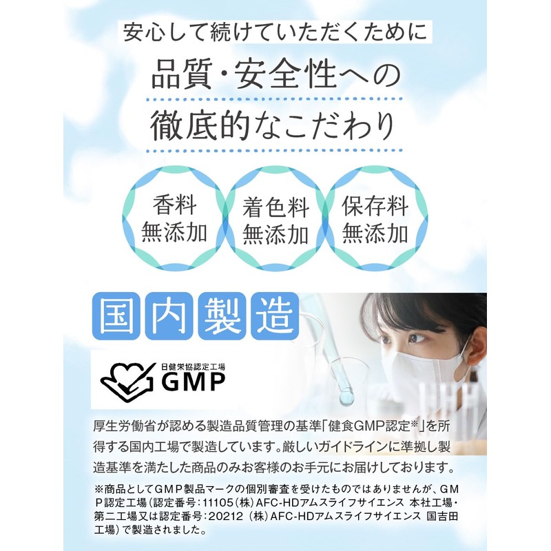 - 国内GMP認定工場(認定番号:11105又は20212)にて製造。安心してお召し上がりいただけます