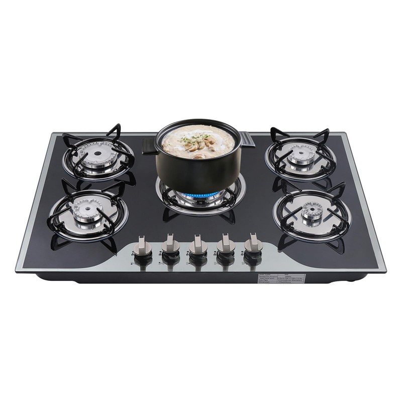 - High Efficiency: 5 burners(3.2kw, 2.75kw, 1.75kw, 1.75kw, 1kw) and the three-dimensional air intake structure makes the gas stove multi-directional make-up air, which can be burned efficiently, making the bottom of the pan heated evenly, and ensuring sufficient firepower when cooking.