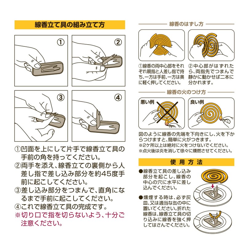 • (How to burn the Incense) When smoking, please always place it in an ashtray or suitable can. Turn the tip of the incense stick downward and start the fire from the bottom to make it easy to ignite. Please do not ignite at least 2 places