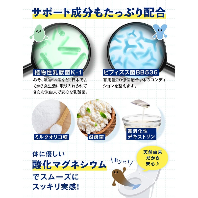 - ビフィズス菌、植物性乳酸菌K-1で体内フローラをサポート