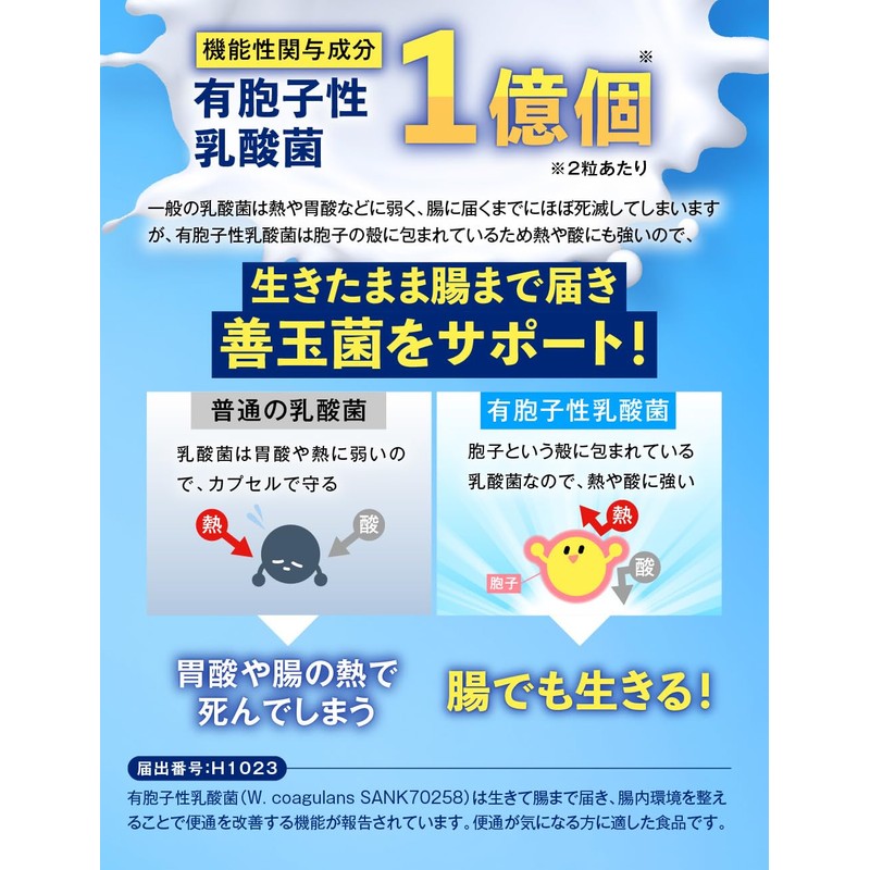 - 機能性関与成分「有胞子性乳酸菌」を1億個配合/2粒あたり