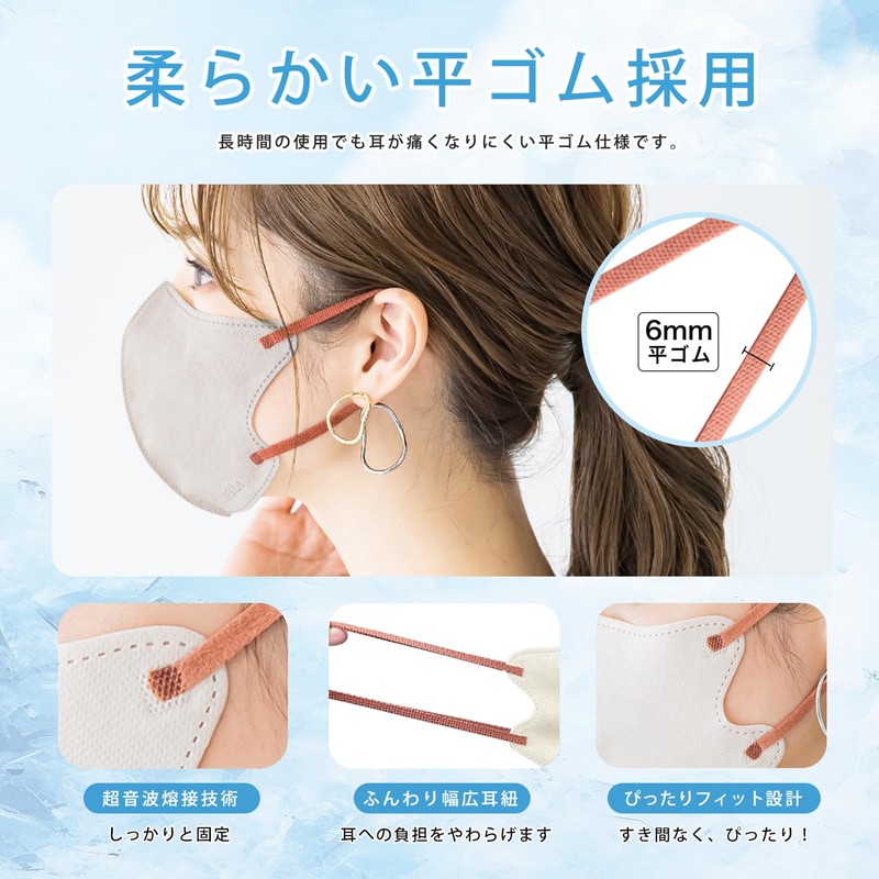 • 幅6mmの柔らかく高い伸縮性を持つ耳紐を採用し、長時間の着用でも耳に負担がかかりにくい設計です。