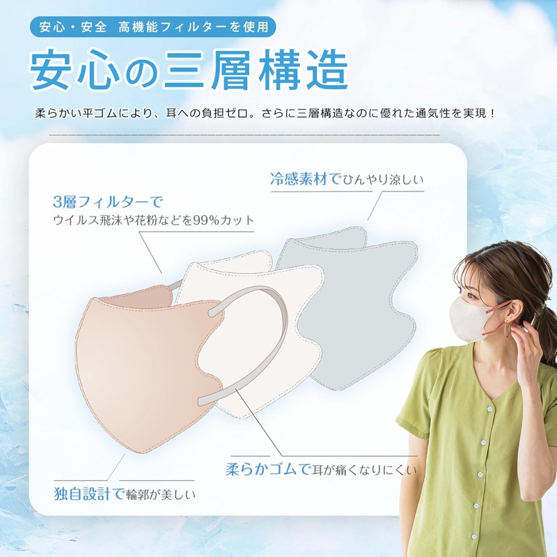 • 【花粉対策】不織布と不織布の間にメルトブローン不織布を挟み込むことで、99.9%のカット率を実現。花粉対策に最適な商品です。
