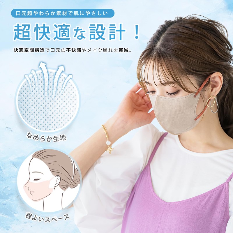 • マスクの中に程よい空間ができるので、呼吸しやすく、長時間つけていても快適に過ごすことができます。