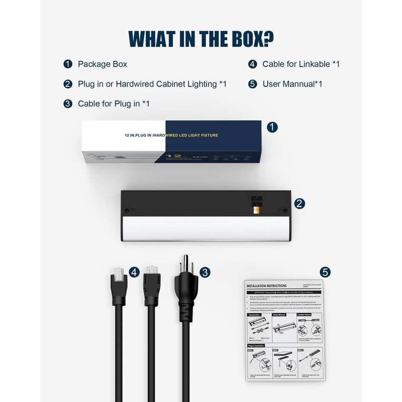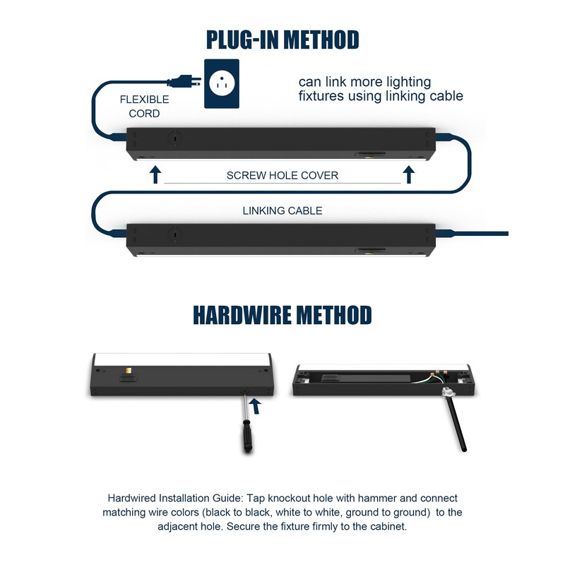 - Plug-in or Hardwired: Easy to install - This plug-in lighting device under the cabinet is equipped with 2 connecting cables, and installation only takes two steps. Hardwired installation only requires attention to Green to Ground, White to Neutral, Black to Live