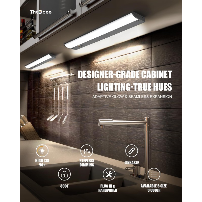 30" LED Under Cabinet Lighting Hardwired & Plug in, 3CCT Selectable (Warm White, Cool White and Daylight) Stepless Dimmable, Linkable with 2 Cords Under Counter Lights for Kitchen, CRI94, Matte Black