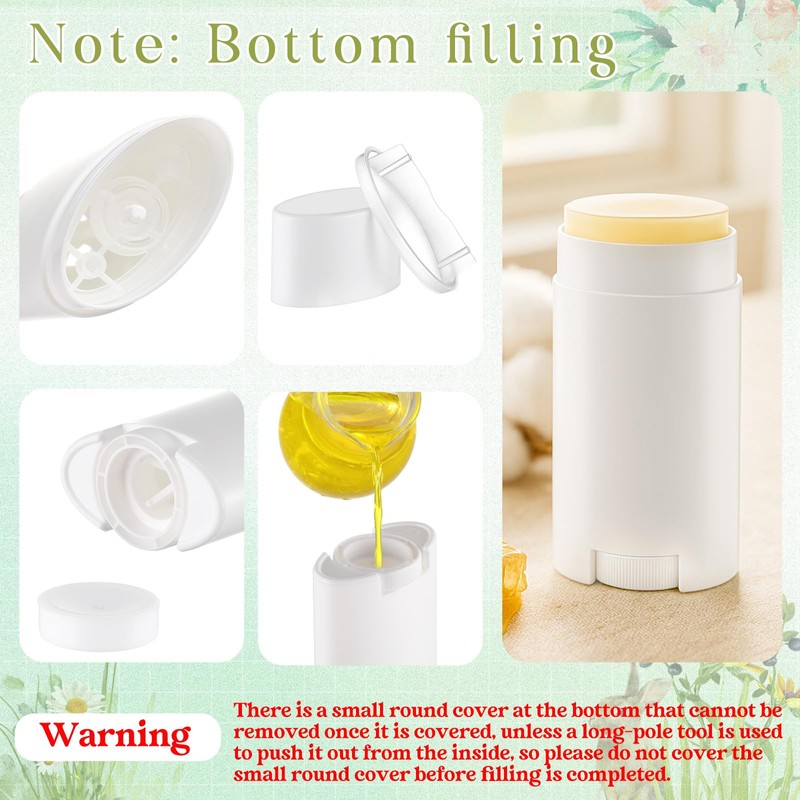 - Twist up Design and Fill from the Bottom: every deodorant container has a turning wheel mechanism, twist up bottoms, adjust up and down nicely; Please fill directly from the bottom hole of the container, never filling from the top, please do not fill it too full, wait for the liquid to solidify/cool, and then cover with the included round cap, and you can dispense the deodorant by turning the wheels on the bottom, nice for making your own deodorant and cosmetics