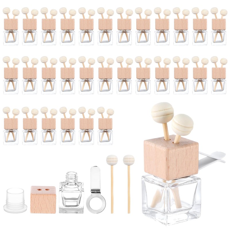 30 Pack Car Diffuser Air Freshener Bottle Empty Car Essential Oil Diffuser Auto Glass Perfume Diffuser Bottle with Vent Clip Wooden Caps Stick Fragrance Ornament