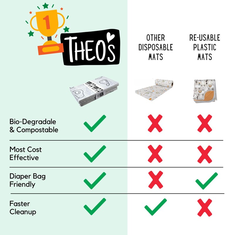 - 👜 DIAPER BAG FRIENDLY – Each 47” x 29” mat comes individually folded 5" x 8" so you can always have a few on hand to avoid cleaning the floor at restaurants or family and friends' homes.