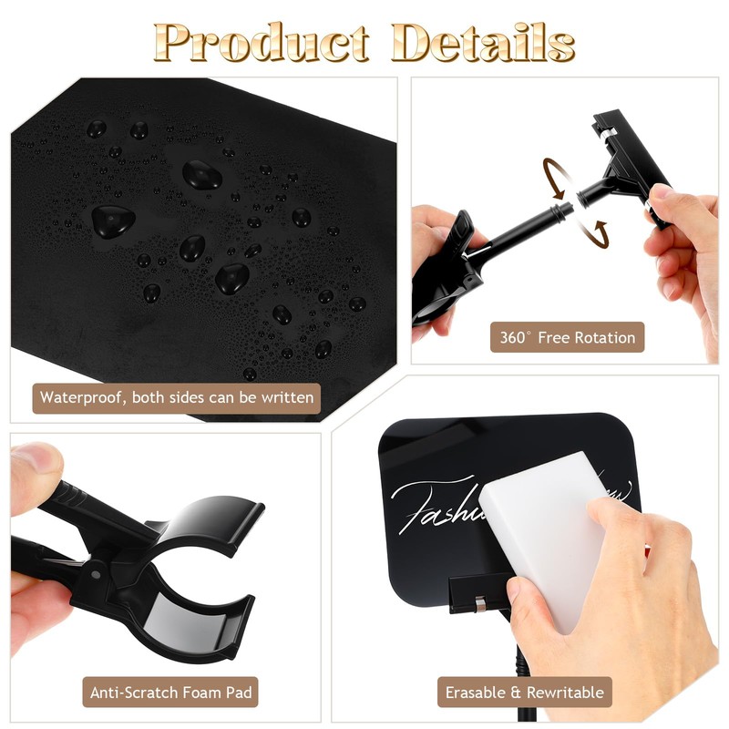 This 30-pack set includes mini chalkboard signs with clip (5.7x3.9 inches). The clip on sign holder features 360° rotation and strong grip, perfect as price signs for vendors. Made of waterproof PET chalkboards and ABS plastic sign holder clips, these reusable sign clips organize retail spaces, cafes, and markets with professional clarity.