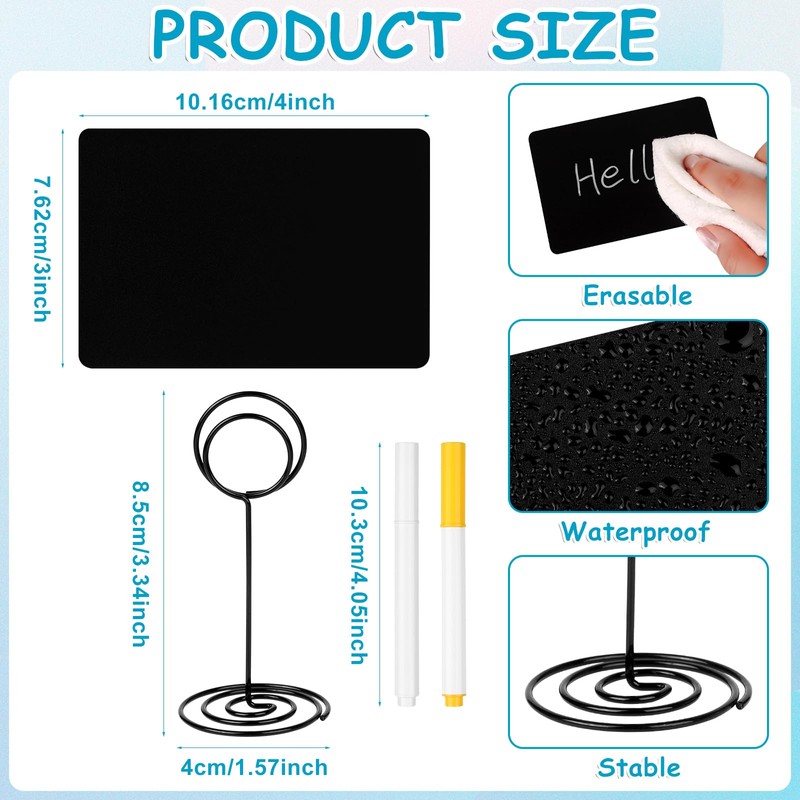 - PVC MATERIAL: These mini chalkboards and their stands are made of black plastic and wire material, anti fall for repeated use; They don't get moldy from humidity.