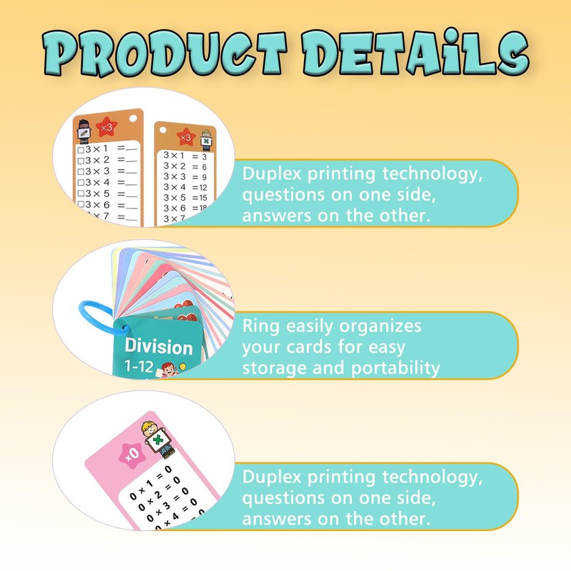 - Printed on both sides: each 1x1 game is printed on both sides, one side is the question and the other side is the answer. For children, it is convenient to check and rate their answers after answering the questions. The erasable pen in the set only needs to be wiped lightly with a cloth to erase the answer, and learning cards mathematics for multiplication and division can be used repeatedly.