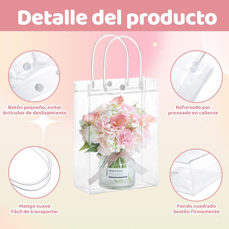 - Diseño transparente: esta bolsa de regalo está hecha de material de PVC. El interior de la bolsa de regalo es transparente y visible. Se puede utilizar para exhibir sus exquisitos artículos personales o regalos. Es exquisito, moderno y reutilizable.