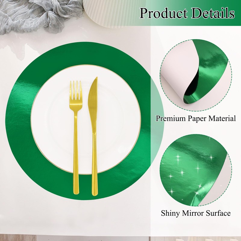 - What You Will Get: 30 pieces green shiny paper placemats, 13X13inch(33X33CM), enough quantity for most occasions table decoration use.You can use them as disposable placemats or wipe them clean and store them away for next time.