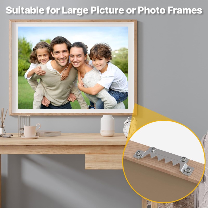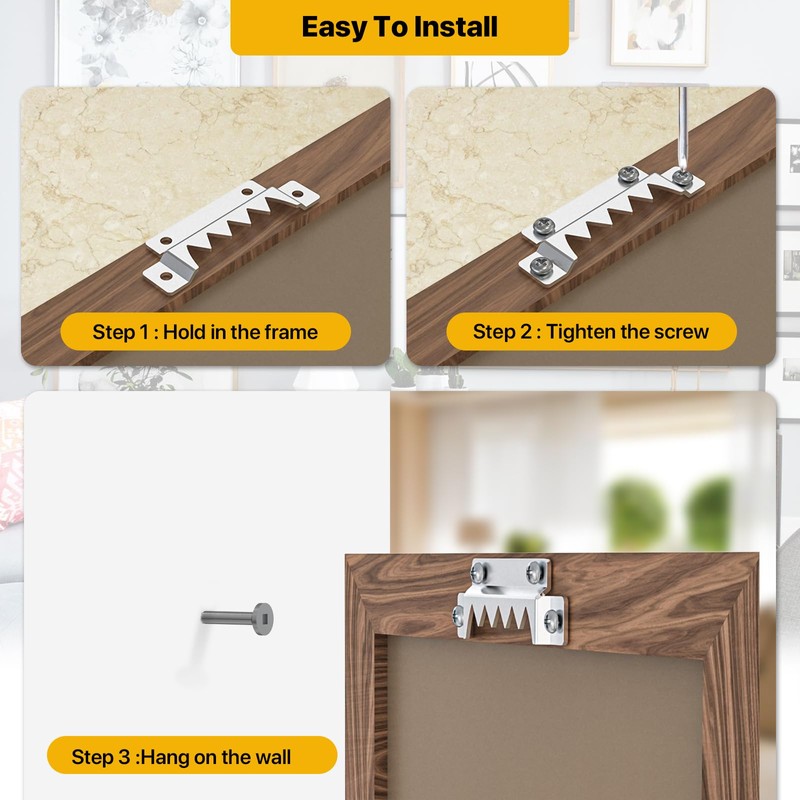 - 【EASY TO INSTALL】:The heavy duty picture hanging hardware is very easy to install. Step 1: Secure the sawtooth hanger to the back of the picture frame with screws. Step 2: Hang the picture frame sawtooth hook on a nail or hook on the wall.