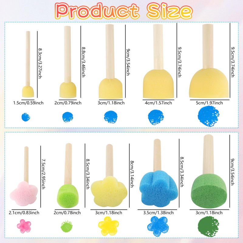- Beautiful set: this beautiful sponge brush set contains a total of 30 round painting sponges with wooden handles and 5 flower-shaped mushroom sticks sponge brushes. The sponge brushes are available in 5 different sizes to meet the needs of you and your children on different occasions; the flower-shaped mushroom stem sponge brushes are available in 5 different shapes and colours to create and combine unique shapes and patterns.
