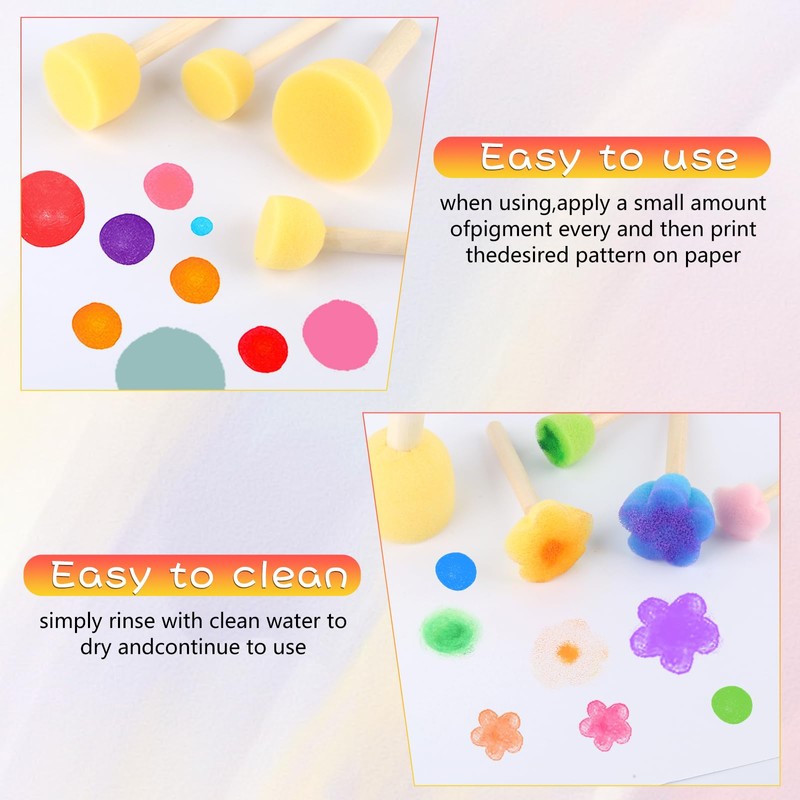 - Easy to clean: sponge brushes can be easily washed with water or soap, dried and reused, so that children can show their creativity anywhere, anytime, at home or outdoors. If the acrylic painting accessories deform, it can be soaked in warm water for 5 minutes to restore its shape.