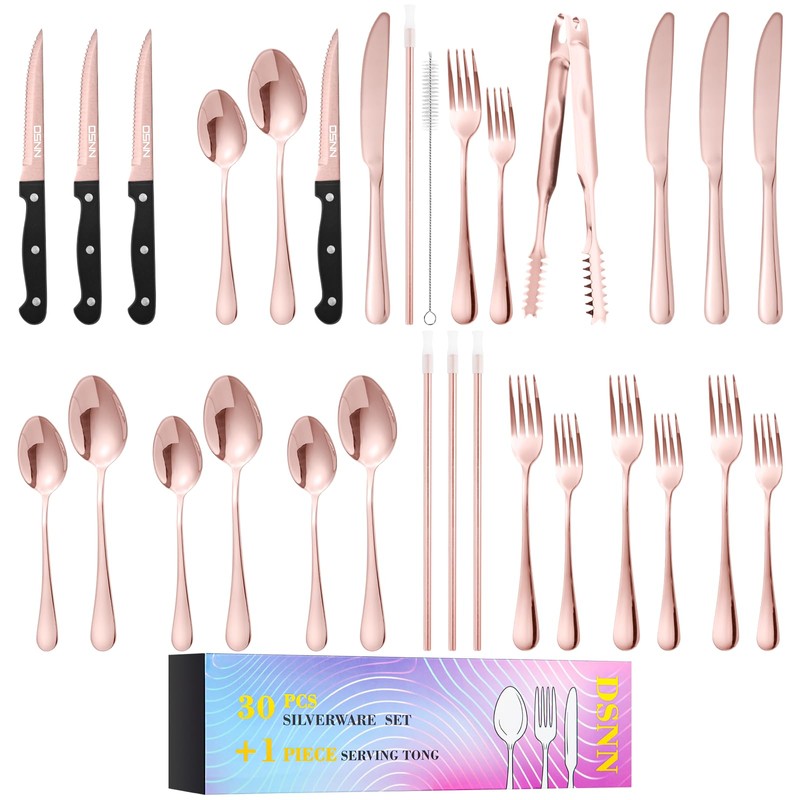 30 Pieces Rose Gold Silverware Sets Plus Serving Tong,Stainless Steel Flatware Set with Metal Straw for 4, DSNN Home Kitchen Utensil Cutlery Set,Include Forks Spoons and Knives Set