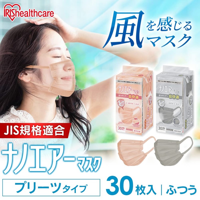 [アイリスオーヤマ] マスク 不織布 ナノエアーマスク プリーツマスク 30枚入 ふつうサイズ 息快適 個包装 夏マスク 涼しい 不織布マスク 小顔 プリーツマスク 血色マスク チークマスク カラーマスク おしゃれ 耳が痛くならない PK-TN30LAG アッシュグレー