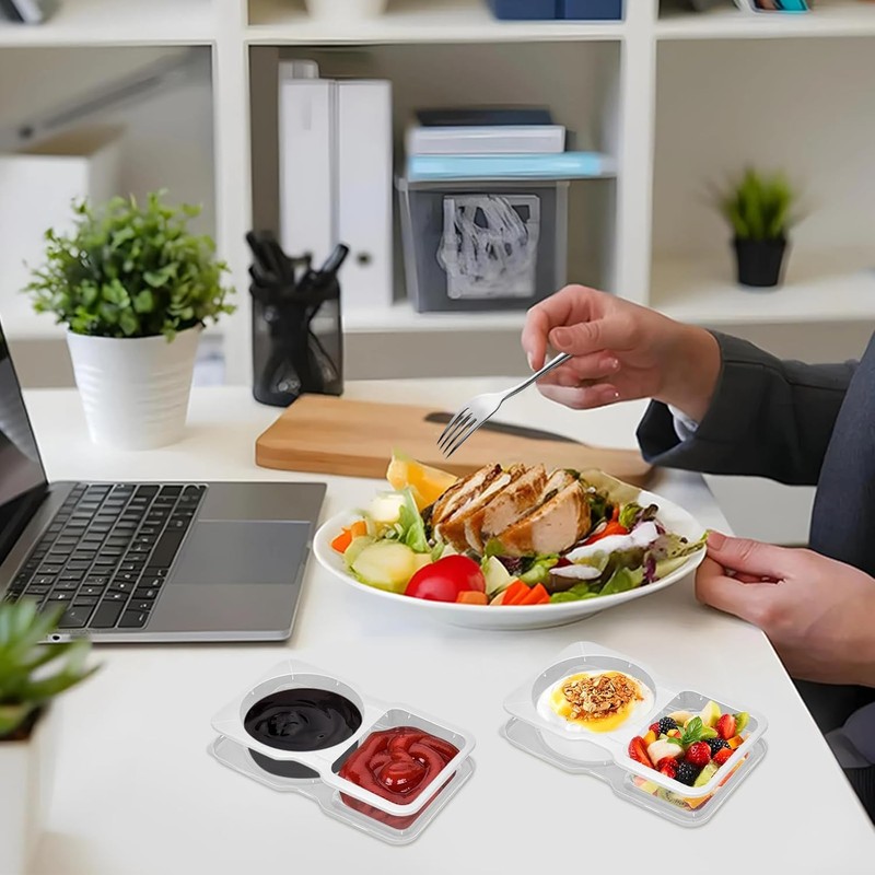 - [Multipurpose Packaging] The Two Compartment Snack Container,Double Condiment Containers With Lids Has An Inwardly Buckled Design,with Good Sealing,leak-proof And Lightweight Features,Convenient To Carry,It Can Be Used For Takeout Orders,Delivery Services,Restaurants And More