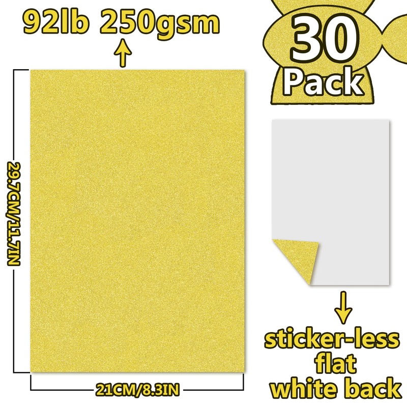- Premium Glitter Cardstock - Highest practical Letter Size(21.6*27.9CM). Reasonable sheet count of 30. 250gsm/92lb heavyweight thick card stock.