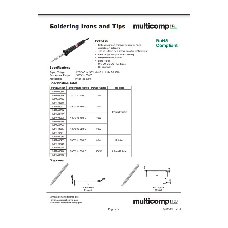 This Multicomp Pro MP740759 is a general purpose soldering iron, suitable for electrical work on small to medium wires and cables.