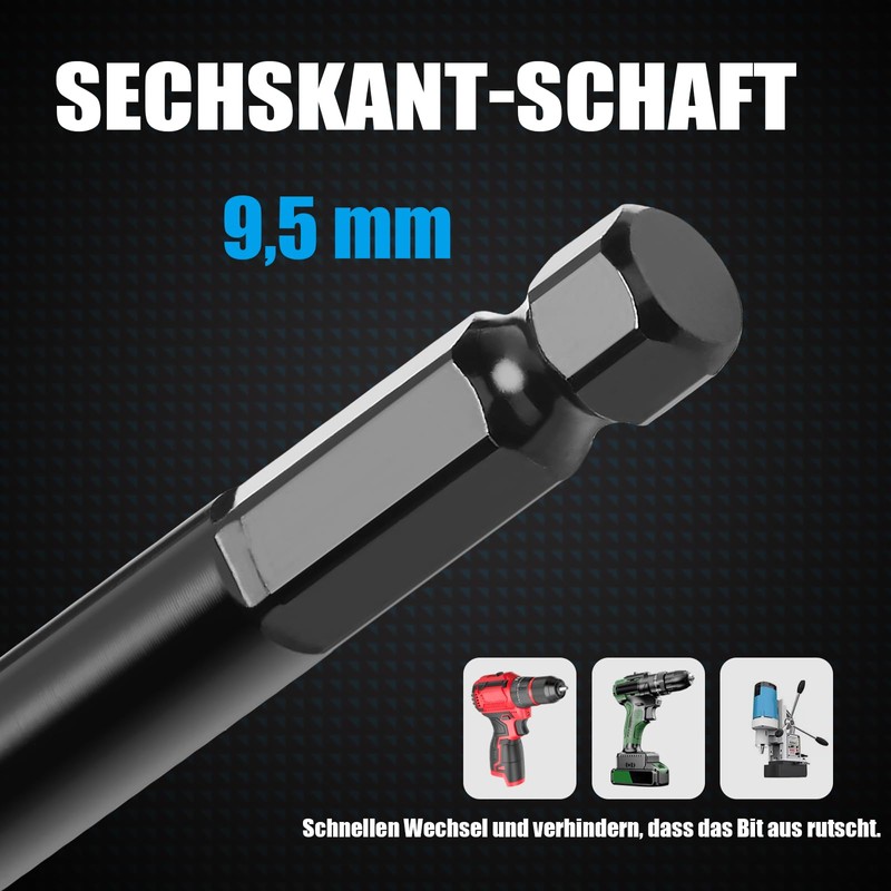 - E9.5 mm hexagonal shank fits for quick change and prevents the bit from slipping.