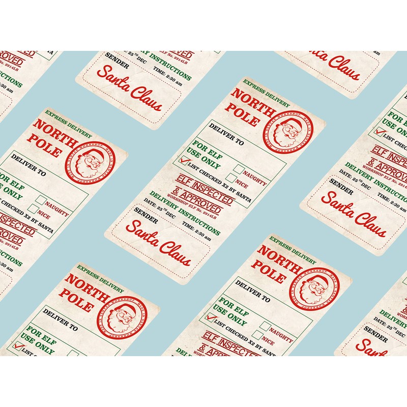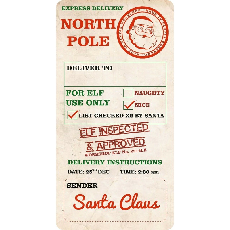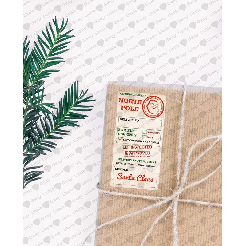 NORTH POLE Christmas Present Stickers - SMALL. Each order comprises of 30 stickers. Printed and contour cut on high quality matt vinyl. Easy to write on using biro, felt pen or similar. Simply Peel and Stick