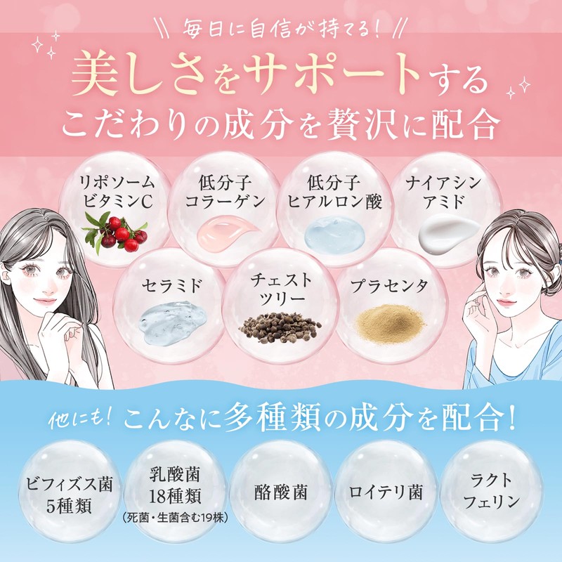 - 【さらに美しさをサポート】女性が嬉しいリポソームビタミンC、低分子コラーゲン、低分子ヒアルロン酸、ナイアシンアミド、セラミド、チェストツリー、プラセンタ、ビフィズス菌5種類、乳酸菌18種類、酪酸菌、ロイテリ菌、ラクトフェリンを配合しました!